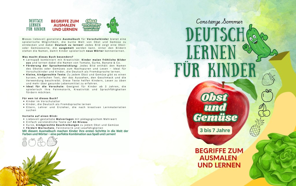 Dieses liebevoll gestaltete Buch zum Ausmalen für Vorschulkinder und kleine Deutschlerner (DAF) bietet eine spielerische Möglichkeit, die bunte Welt von Obst und Gemüse zu entdecken – und dabei Deutsch zu lernen! Jedes Bild zeigt ein Obst- oder Gemüsesorte, die ausgemalt werden kann. Unter den Bildern stehen die Namen, damit Kinder spielerisch neue Wörter kennenlernen. Zusätzlich gibt es noch einen kleinen Text mit der Beschreibung. So lernen Kinder spielerisch die deutsche Sprache zu lesen und zu verstehen. Dieses Buch ist nicht nur für ausländische Kinder geeignet sondern auch für deutsche Vorschulkinder und Kinder der 1. und 2. Klasse.